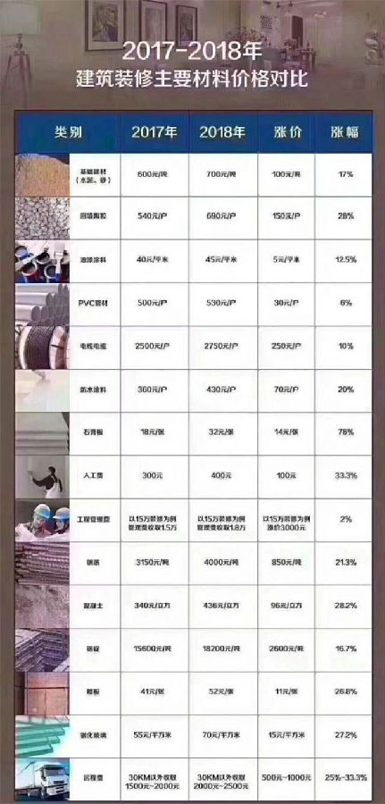 隨著經(jīng)濟(jì)的發(fā)展生活水平的提高,2018年用工成為也在相應(yīng)的漲價(jià),同時(shí)由于國(guó)家對(duì)林區(qū)的保護(hù),木質(zhì)建材漲幅比較明顯,相對(duì)于往年2018年在裝修建筑行業(yè)整體漲價(jià)。